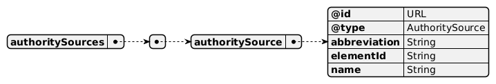 { "authoritySources" : [ { "authoritySource" : { "@id" : "URL", "@type" : "AuthoritySource", "abbreviation" : "String", "elementId" : "String", "name" : "String" } } ] }