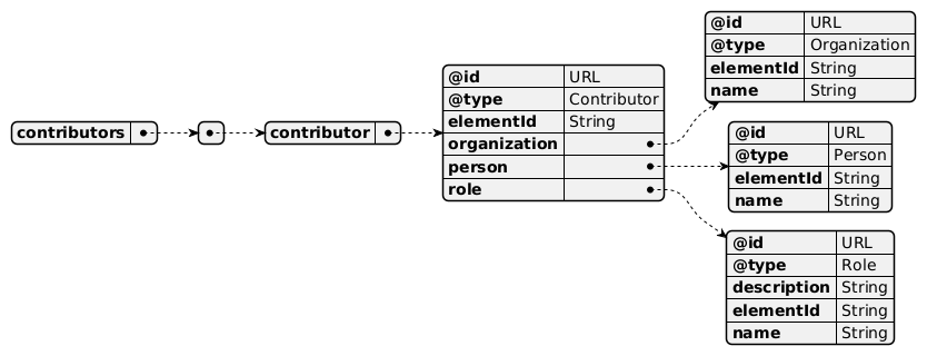 { "contributors" : [ { "contributor" : { "@id" : "URL", "@type" : "Contributor", "elementId" : "String", "organization" : { "@id" : "URL", "@type" : "Organization", "elementId" : "String", "name" : "String" }, "person" : { "@id" : "URL", "@type" : "Person", "elementId" : "String", "name" : "String" }, "role" : { "@id" : "URL", "@type" : "Role", "description" : "String", "elementId" : "String", "name" : "String" } } } ] }