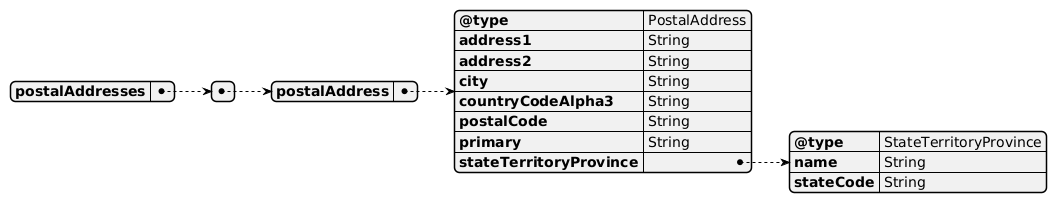 { "postalAddresses" : [ { "postalAddress" : { "@type" : "PostalAddress", "address1" : "String", "address2" : "String", "city" : "String", "countryCodeAlpha3" : "String", "postalCode" : "String", "primary" : "String", "stateTerritoryProvince" : { "@type" : "StateTerritoryProvince", "name" : "String", "stateCode" : "String" } } } ] }