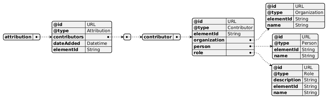 { "attribution" : { "@id" : "URL", "@type" : "Attribution", "contributors" : [ { "contributor" : { "@id" : "URL", "@type" : "Contributor", "elementId" : "String", "organization" : { "@id" : "URL", "@type" : "Organization", "elementId" : "String", "name" : "String" }, "person" : { "@id" : "URL", "@type" : "Person", "elementId" : "String", "name" : "String" }, "role" : { "@id" : "URL", "@type" : "Role", "description" : "String", "elementId" : "String", "name" : "String" } } } ], "dateAdded" : "Datetime", "elementId" : "String" } }
