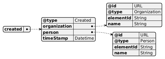 { "created" : { "@type" : "Created", "organization" : { "@id" : "URL", "@type" : "Organization", "elementId" : "String", "name" : "String" }, "person" : { "@id" : "URL", "@type" : "Person", "elementId" : "String", "name" : "String" }, "timeStamp" : "Datetime" } }
