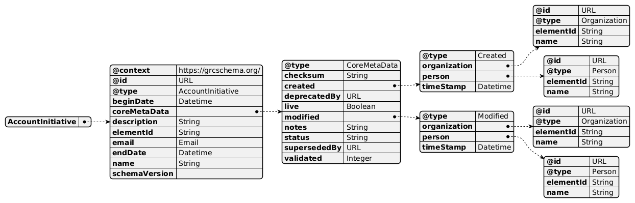 { "AccountInitiative" : { "@context" : "https://grcschema.org/", "@id" : "URL", "@type" : "AccountInitiative", "beginDate" : "Datetime", "coreMetaData" : { "@type" : "CoreMetaData", "checksum" : "String", "created" : { "@type" : "Created", "organization" : { "@id" : "URL", "@type" : "Organization", "elementId" : "String", "name" : "String" }, "person" : { "@id" : "URL", "@type" : "Person", "elementId" : "String", "name" : "String" }, "timeStamp" : "Datetime" }, "deprecatedBy" : "URL", "live" : "Boolean", "modified" : { "@type" : "Modified", "organization" : { "@id" : "URL", "@type" : "Organization", "elementId" : "String", "name" : "String" }, "person" : { "@id" : "URL", "@type" : "Person", "elementId" : "String", "name" : "String" }, "timeStamp" : "Datetime" }, "notes" : "String", "status" : "String", "supersededBy" : "URL", "validated" : "Integer" }, "description" : "String", "elementId" : "String", "email" : "Email", "endDate" : "Datetime", "name" : "String", "schemaVersion" : "" } }