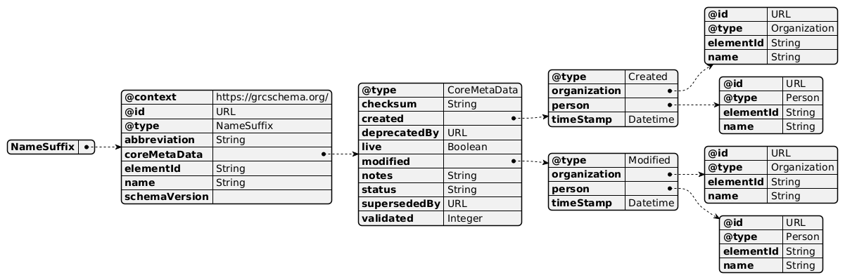 { "NameSuffix" : { "@context" : "https://grcschema.org/", "@id" : "URL", "@type" : "NameSuffix", "abbreviation" : "String", "coreMetaData" : { "@type" : "CoreMetaData", "checksum" : "String", "created" : { "@type" : "Created", "organization" : { "@id" : "URL", "@type" : "Organization", "elementId" : "String", "name" : "String" }, "person" : { "@id" : "URL", "@type" : "Person", "elementId" : "String", "name" : "String" }, "timeStamp" : "Datetime" }, "deprecatedBy" : "URL", "live" : "Boolean", "modified" : { "@type" : "Modified", "organization" : { "@id" : "URL", "@type" : "Organization", "elementId" : "String", "name" : "String" }, "person" : { "@id" : "URL", "@type" : "Person", "elementId" : "String", "name" : "String" }, "timeStamp" : "Datetime" }, "notes" : "String", "status" : "String", "supersededBy" : "URL", "validated" : "Integer" }, "elementId" : "String", "name" : "String", "schemaVersion" : "" } }